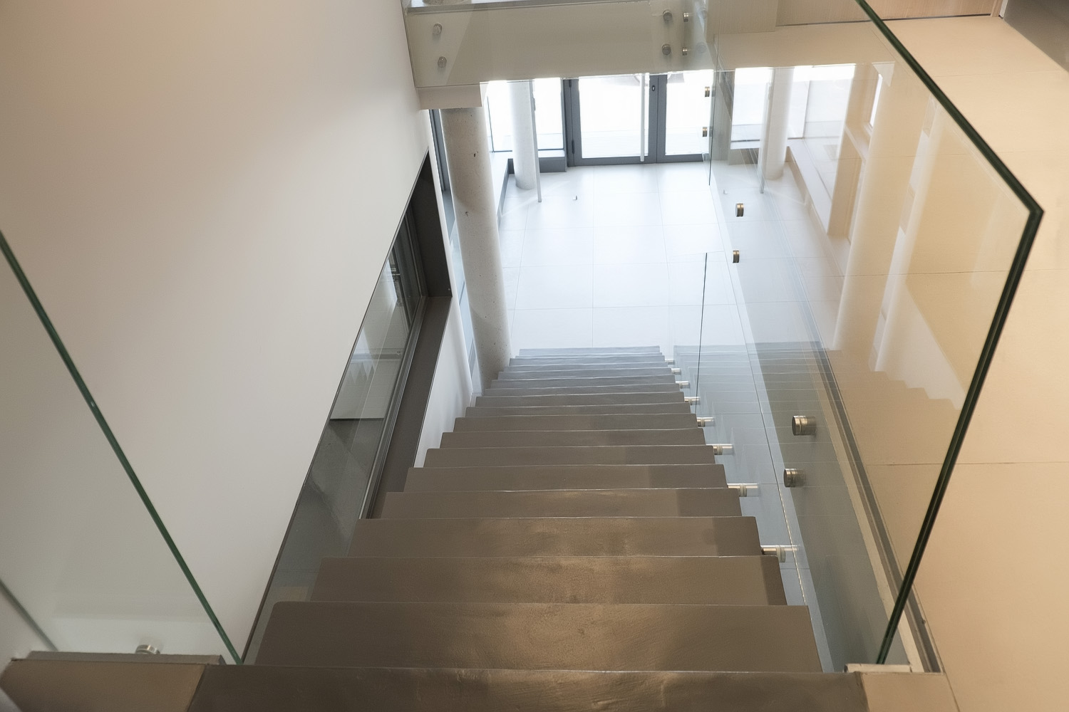 Se realiza la barandilla para chalet de 3 plantas, sobre zanquín, colgada al canto del forjado de la escalera para que ocupe menos espacio. El pasamanos se iguala...